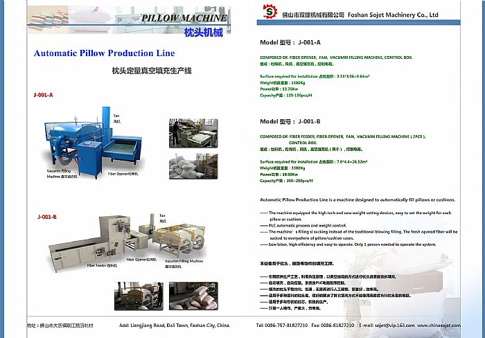 本套设备由松棉机与真空填充机组合成填充生产线,集开松填充于一体,采用电脑程序自动控制、自动定量,全程只需一人即可完成操作,而且枕芯填充平整、高档。每小时最高填充量达150-200个以上。是大批量枕芯生产厂家的最佳选择。