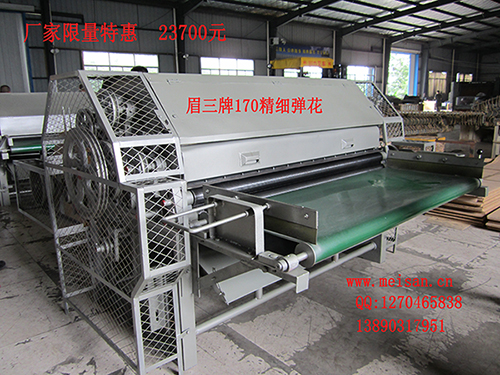 170精细弹花机的构成: 精细弹花机又叫弹花机,该机器是由自动进料帘,进料架、除尘刀、机架、进倒档系统、吃花杆(罗拉)系统、刺辊、锡林、工作辊、转移辊、道夫、圆架板、托架、斩刀、收棉筒系统等组成 170精细弹花机产品参数型号:6MTB170 产量:≥30Kg/H(一遍)刺辊转速:776转/分刺辊配用刺条:109#刺辊直径:230mm整机尺寸:2800×2500×1400 配套动力:锡林电机380V 3.0-4.0KW 斩刀电机0.75-1.0KW 170精细弹花机特点: 作为集合多款弹花机和梳棉机优点于一身的多功能弹花机。它具有:一次成型,自动喂棉,开松梳理棉花,耗电低,占地面积小等特点。还可加工羊毛被,化纤被等。用该多功能弹花机加工的棉絮质量好、不分家、柔和、温暖,舒适,贴身。该机能将棉花梳得像纸一样薄且不伤纤维,梳的棉胎纤维都很顺柳且均匀地相互交粘着,梳的棉卷叫无网棉,做出来的棉絮叫无网被,还可制成无网棉胎,更科学、更暖和!终生包用!精细弹花机的工作原理: 将去杂后的棉花轻轻地均匀地(不可过厚)铺在自动进料帘上,机器自动进料;进料帘将棉花送到罗拉口,由罗拉将棉花梳理后送到刺辊前,棉花即被刺辊钩拉着松开。其中杂质受刺辊离心力的作用,在除尘刀的作用下,将沿刺辊的切线方向抛出。棉花开松后的纤维通过锡林、工作辊、转移辊多次反复转移、梳理、混合均匀后。再由道夫经剥棉斩刀剥离后,输出一层一层像纸一样薄的纤维;刚梳出棉花时用细竹杆轻轻挑上卷棉筒即可实现自动卷棉。棉卷做好后,断电,让机器停止,用剪刀剪断卷棉筒上的棉胎,用竹杆挑着,轻轻放到运棉板上,根据做棉宽度轻轻抖动(出棉宽度可控制),就能达到我们需要的长度和宽度。再放入揉磨机下揉磨2分钟,推出棉胎,收边、收角,翻面再揉2分钟即可制成千层无网纯棉胎。