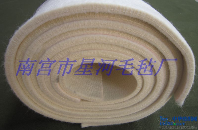 南宫星河毛毡厂专业生产耐高温100℃-280℃系列产品厂家。历经十多年的积累,现已拥有多种专业设备,先进技术和完 善售后服务公司创立于1998年,自建立以来,在吸收原呢毯类企业产品优点的基础上依靠技术人员的研发对各类呢毯内部基布结构进行了重大改造,采用了聚酯干网不易伸长,收缩的特性,替代了原有市场上呢毯生产惯用的毛棉,帘子线基布生产呢毯.为此公司生产的呢毯,套毯类产品具有门幅收缩概率小,周长不易伸长的特点。