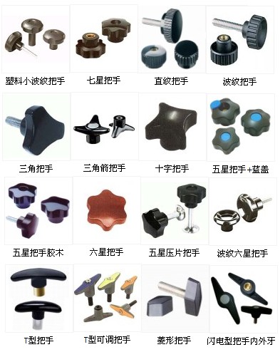 把手款式多,T型把手,三角把手,十字把手,五星、六星、七星、八星、条纹、波纹、波纹六星把手...材质有塑料,胶木材质。把手可以做内牙,通孔,外牙等。