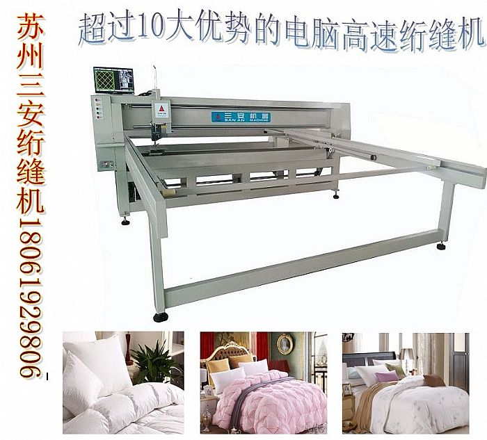 HFJ-D型电脑绗缝机的外形及规格。是制作各种床被、垫罩的缝制设备,缝制效率快、花样美观、图形精细。该产品总体布局合理,整体性好,并始终坚持吸收国内外先进技术与创新相结合的指导思想,以高起点、上档次、创国内先进水平为目标,精心设计,反复改进,目前已达到同类产品的领先水平。主轴伺服控制系统、X及Y向运动使用伺服控制系统,运行平稳、特低噪音、高精度复杂花形时可提高20%的效率。