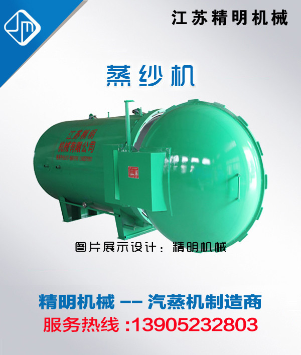 江苏精明机械有限公司,有多年设计生产真空热定型设备的经验,产品远销国内外,所生产的KSZX系列/QZD系列真空干湿两用定形蒸箱已有海内外家用户,深受好评,在业界享有良好的口碑。现吸取国外同行先进技术并结合国内用户的实际需求推出加湿定形蒸纱机(锅),间接蒸气环保电制热蒸纱机(锅),产品质量达到世界同行业先进水平。 精明牌蒸纱机(锅)广泛适用于缝纫线、真丝、长丝、棉纱、羊绒、商标丝、腈纶丝束、印花毛条等多种纤维的调湿、定形及起皱布定型,雨伞布着色,印花布着色,花边、窗帘、毛巾印花定型、起绒,羊绒绣花定型等。 一.蒸纱机技术参数: KSZX-8蒸纱机每次纱线处理时间约2小时。 8m3容量空间,载重量为 1000KG/次(可依客户需求定制不同载重量设备) 处理每吨纱能耗约50KWh或150KG蒸汽。 采用双蒸空技术,真空泵处理每吨纱耗电约2KW/h。 工作温度:50℃—120℃。 工作压力:–0.085-0.1MPA。 彩色触摸屏加PLC控制。 全自动开关门系统(选配, KSZX-8-ZDM型号)。 二.蒸纱机主要功能及特点 1. 蒸纱机适用于纱线、涤纶线、毛线、毛条、化纤线、海绵擦布、窗帘定型、氨纶包覆纱线、棉纱、人造丝、涤论、电脑绣花线、缝纫线、针织线、曲珠线、花边线、拉链线等纱线的真空定形。 2. 其主要用途是将具备织造条件的连续丝线在合并,加捻后进行定型,即在一定压力,温度下稳定捻度,获得均衡的不扭缩的丝线。 3. 蒸纱机设备配有先进的电加热系统,无需蒸汽即可轻松实现纺织行业各种纱线纤维的加湿回潮和定捻型。快开门结构安全可靠. 4. 此蒸纱机是从低温到高温对纱线或织物进行均匀、精确、柔和的汽蒸处理设备,采用微电脑控制汽蒸工艺,温度控制精确到±0.5℃,确保蒸纱工艺按预算的工艺精确重现,最大限度地避免冷凝水的产生,使纱线得到均匀、柔和的汽蒸处理。 5. 纱线经该机快速负压饱和蒸汽调整后,能从里到外均匀地增加,提高质量,定型定捻,并能保持原纱的外型风格,无黄斑,无污染,纱管不变形。 6. 采用优质容器板,经久耐用,安全、环保,抗压性好。该设备采用一键启动,密封性能好。
