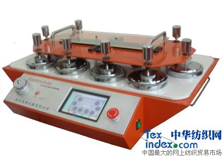 YG401E型全自动织物平磨仪(马丁代尔仪) 适用范围:该仪器适用于大多数织物(对毛机织物更为适宜)受轻微压力情况下起球程度及细簿类棉、麻、绢丝机织物耐磨损的方法测定。 相关标准: GB/T4802.2、ASTM D4970、ISO12945-2、 GB/T13775、ASTM D4966、ISO12947、 JIS L 1096 测试模式: 模式一: 圆形试样与同样材料织物在给定的压力 下,以李莎如Lissajous图形运动轨迹进行磨擦,达到规定的转数后,评定试样起毛起球等级。该原理对应于标准规定的织物起毛起球程度的试验。 模式二: 圆形织物试样在一定的压力下,与标准磨料按李莎如(Lissajous)曲线的运动轨迹进行互相磨擦,导致试样破损,以试样破损的耐磨次数表示织物的耐磨性能。该原理对应于标准规定的织物耐磨性能试验。 模式三: 圆形织物试样在一定的压力下,与标准磨料按直线的运动轨迹进行互相磨擦,导致试样破损,以试样破损的耐磨次数表示织物的耐磨性能。该原理对应于标准规定的织物耐磨性能试验。 仪器特性: 1.绝妙的结构设计,无需移动盖板即可轻松装卸试样。 2.多种测试模式可供选择。 3.电子部分由触摸屏和法国原装进口的可编程序控制器PLC控制,完全实现了模块化,比单片机控制更加可靠,抗干扰更强,不易死机。 4.外形美观大方,采用台达7寸655366色彩色触摸屏控制,中英文双选菜单操作。 5.采用触摸屏使得界面清晰、形象,操作更加直观、方便。 6.采用八工位设计,试验效率大幅提高。 7.配有两套磨头,可同时做起球和耐磨功能,并可执行国标及美标。 8.采用减计数及加计数两种功作模式,方便用户选择。 基本技术规格说明: 1. 工位数 : 8位 2. 计数显示: a.预计计数: 0~999999次 b.累计计数: 0~999999次 3. 最大动程: 24±0.5mm 、60.5±0.5mm 4. 加压物质量: a.夹持器: 200±1g b.衣料试样重锤 : 395±2g c.家具装饰品试样重锤 :594±2g d.不锈钢蝶片: 260±1g 5. 磨块有效摩擦直径 : A型 200g(1.96N)摩擦头 ¢ 28.8 -0.084mm、 B型 155g(1.52N)摩擦头 ¢ 90 -0.10mm 6. 夹持器与磨台相对运动速度: 50-2r/min 7. 装样压锤质量: 2385±10g 8. 外形尺寸: 885×600×410mm (L×W×H) 9. 重 量: 115kg 10.电 源: Ac220V 50Hz 500W