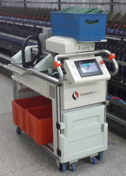 元裕智能落纱机特点: 1. 多轴连杆机械手抓放,顶部抓取,垂直拔插一次完成。 2. 对锭子无损伤。 3. 单面仅需 1 人辅助操作,大大减少企业用工,劳动强度大幅降低。 4. 适应光锭杆和铝锭杆落纱。 5. 适应从低支到高支纱的普通纺,紧密纺,氢纶包芯和赛络纺等落纱。 6. 适应任何长短机型改造使用。 7. 光锭杆尾纱无需专门清理,减少维护工作量。 8. 故障报错主动显示,实现“自动化”。