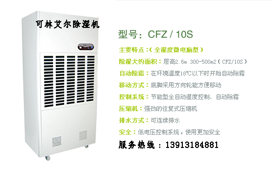 车间潮湿怎么办?产品质量不达标怎么办?试试用可林艾尔工业除湿机!可林艾尔工业除湿机节能环保,除湿强劲,您的车间生产,物品存储保驾护航!24小时服务热线:400-806-6628 可林艾尔车间抽湿器,仓库抽湿器,地下室抽湿设备CFZ-10S技术参数 除 湿 量: 240升/天 适 用 范 围: 250~400平方米/层高2.6米 电 源: 380V~50HZ 最大输入电流: 12.0A 额定输入功率: 4.9KW 除 霜 方 式: 自动 循 环 风 量: 2800立方米/小时 排 水 方 式: 水管 使用环境温度: 5-38℃ 压 缩 器保护: 三分钟延时 体 积: 470×770×1630mm 净 重: 150kg 可林艾尔抽湿器原理: cleanair除湿器产品属冷冻式除湿器,整器由压缩器、热交换器、风扇、盛水器、器壳及控制器组成,工作原理是:由风扇将潮湿空气抽入器内,经过制冷系统(压缩器,蒸发器,冷凝器)相互作用下凝结成霜,系统自动升温化霜成水, 产生出干燥空气排出, 如此循环使室内湿度降低,潮湿空间逐步达到干爽的效果 可林艾尔车间抽湿器已广泛用于资料室、图书馆、电脑房、精密仪器室、医院及贵重物品仓库,化纤、制药、军工、玻璃、食品、电子、冶金、印刷、仓库、地下室、档案室、电力、电信、卷烟、医药、印刷、茶叶、纺织等对湿度有要求的场所。