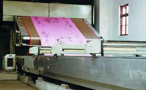 进布系统 ●采用五链轮双传动,能始终保持连续贴布 ●配有伺服电机驱动的红外对边装置,非常灵敏的纠正织物跑偏 ●配有进布处专用吸尘装置,能轻松地除去布面上的绒毛、尘埃 ●配有热塑胶或水溶胶两种方式供用户选择 印花单元 ●采用变频控制系统 ●适合中国国情的汉化操作显示 ●无噪音的同步带驱动 ●重量轻、振动小的提升系统 ●可显示多个参数画面的彩色触摸屏 ●在屏幕上直接调整车速、刮印距离等,极大地方便了您的操作 液压系统 ●采用先进的电液比例控制技术 ●采用双泵双回路 ——实现印花单元C型钢及托网部分的提升; 实现左右两侧不同的提升需要缩短提升、下降时间满足您不同的工艺需要,提高整机运行速度 电气控制系统 ●印花导带传动采用双伺服控制系统 ●印花单元采用PLC控制,变频传动 ●全机电控采用工控机 ●伺服传动、印花单元采用多个PLC进行控制 ●工控机与各PLC以计算机通讯的方式进行数据的采集和交换 ●适合国人操作的全汉化软件设计 HM119型热风烘干机 该型烘干机在设计、制造及使用中,突出了两大特点: ——高效率、高产量、低能耗 ——平稳地传送织物 ●大容布量长流程设计,整个烘干过程中,托辊绝不会与布料的正面相接触,避免造成搭色现象,适合于您对高产量、高印花质量的需要 ●蒸汽加热,热风从输送导带上下方的喷嘴喷向布料,热风风量可根据需要分档调节。 ●可靠的同步系统,使已印花的布料从印花工作台的末端以最小的张力被垂直揭起,并与印花机导带速度同步通过烘干机,整个烘干过程中,实现了无张力控制。 ●便于操作,非常利于检修的外型设计 技术参数: ●幅 宽200cm/240cm/280cm ●套色数 6~16 ●台板长 20~35m ●花回长度 ≤9.9m ●速度可达30m/min
