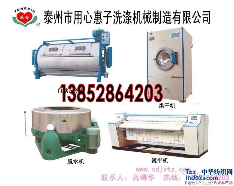 江苏(13852864203 高经理)用心惠子洗涤机械制造有限公司 是一家权威专业生产洗衣房设备,宾馆洗衣房设备配件及成套洗涤清洗烘烫3A级龙头企业。 联系人:高得华(总经理) 手 机:(0)13852864203 总体来说洗衣房设备、宾馆洗衣房设备、酒店洗衣房设备大体可分为四个大类: 1、水洗机类:包括普通工业水洗机,脱水机和洗脱机,洗脱机按其性能不同可分为重力固定式和全悬浮式。(国内产品主要以全悬浮式为主) 2、烘干机类:包括排风式烘干机,复合风道烘干机,智能烘干机等。排风式烘干机按其结构不同可分为顶部吹风式和底部吸风式两种。加热方式又可分为蒸汽加热,电加热方式,天然气加热及其它加热方式. 3、熨平折叠机类:包括单滚熨平机,双滚及多滚熨平机,通用折叠机,专用折叠机,折叠输送机,层叠机等等. 4、熨烫后整理辅助机械类:包括熨烫平台,去渍台,小型蒸汽发生器,衣物运送机械等等。 泰州用心惠子械制造有限公司,座落于著名京剧艺术大师梅兰芳先生的故乡,中国海军的诞生地——泰州。这里毗邻上海、和苏州、无锡、常州隔江相望,人杰地灵、交通便利,公司已有二十余年历史。 公司生产的洗衣房设备,宾馆洗衣房设备,酒店洗衣房设备在全国同行业中均属佼佼者。无论是机器洗涤质量、洗涤性能、设备不猺钢材质的选用、设备各主要部件配比。都比同类兄弟厂家稍高一筹。 首先从我们生产的洗衣房设备中各种产品来看: 一、本公司生产的自动洗脱机采用(广州邦普超大液晶显示屏中文电脑)进行全程控制,以中文显示形式实现人机对话,具有结构简便,准确无误,性能稳定可靠的特点。 本机外壳面板采用304#优质不锈钢磨砂板,更显得富丽堂皇。内桶和外桶均使用304#优质不锈钢,(因304#钢含镍成份高,当机器高速转动时不会发生钢质破裂而产生爆炸现象)具有耐腐性能高,不污染被洗织物。并且对内桶304#不锈钢进行了镜面磨光处理,使得洗涤过程中不会产生勾丝现象,从而达到不损伤被洗织物。 该机采用(韩国产LG变频器进行变频调速),具有启动电流小,耗能低,运转平稳,因而只需用一级胶带传动,具有调速平滑均匀。主传动电机采用江苏名牌产品(微特利变频电机)是专供 格力 、 海尔 企业的合作厂商,性能质量绝对保证。传动功率强劲. 本机采用了全悬浮结构并配置阻尼缓冲系统,使整机的减震率达95%以上。 还具备多项显示,报警,检测功能,便于机器维护,安全及制动装置应用使整机性能更加完善。 在洗涤方面具有洗净度高,能耗低,脱水率高,对织物磨损低等功效等优点。由于我们采用了820mm大口径装料口从而装取方便,达到减少劳动强度,提高工作业效率的功效。 在传动方面,采用了美国铁姆肯轴承,水封采用瑞士进口水封 使得传动和密封性能更加完美,