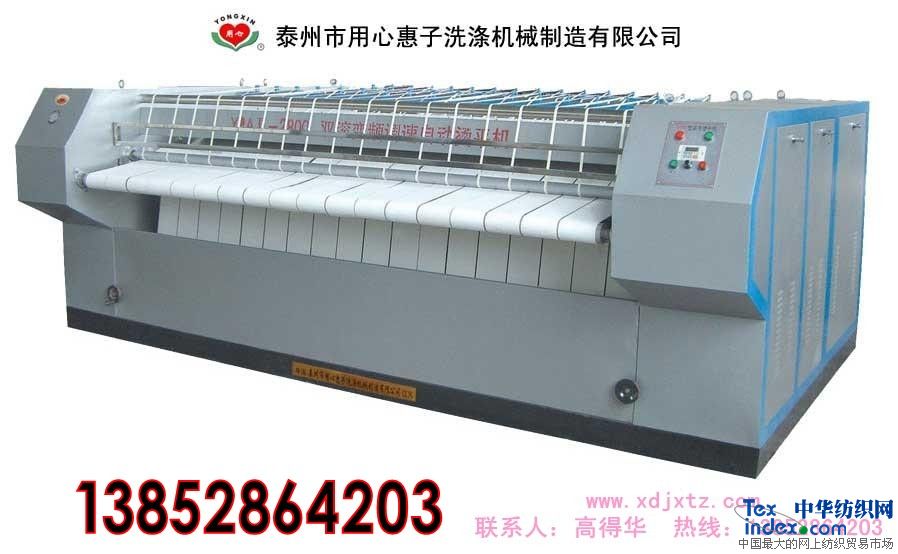用心惠子(泰州)洗涤机械制造有限公司所有产品均通过希腊NOVA认证公司(NOVA CERTIFICATION LTD)CE欧盟体系认证。并拥有自主经营进出口权利。 联系人:高得华(总经理) 手 机:(0)13852864203 烫平机简介: 烫平机是洗涤机械的一种,属于洗衣房熨整设备。其主要部件一般是单个、两个辊(现代的烫平机可能含有三个辊),辊通过手摇或通过电力使之转动。辊筒由蒸汽或者电加热,达到一定温度后,当潮湿的衣物经过两个辊之间被轧过之后,可以除去大量的水分,且达到烫平的效果,用于床单、桌布、布料等等的轧平过程。 烫平机发明于18世纪,到了19世纪末期,蒸汽引擎被引入到了洗涤机械的设计中,于是用于工业的蒸汽烫平机出现了。20世纪40年代,电力烫平机被发明。此时,电力的应用、设计的改进使得烫平机的效率有了很大的提高,从而,在工业应用上,烫平机彻底取代了熨斗和熨板而成为主流的熨烫工具。 自动熨平机采用大直径滚筒(∮800mm)滚筒厚度为3 mm,热效率高,熨烫速度快,滚筒采用(304#)优质不锈钢,耐腐性能好,安全性能高,使用寿命长 桥架采用12#国标马钢槽钢制作,从而达到基础牢固,不易产生熨烫带的游动现象。 熨烫速度可根据织物厚度与蒸汽供应状态任意调节(无级调速)采用差动柔性送料系统。织物熨平效果提高。 本机采用大速比摆线针轮减速机。由链条传动,超负荷能力强,噪音低,各链条均有张紧装置,方便调节松紧。 本机采用宽绽带传送,并用隔圈相隔开,避免了绽带在传送中难以解决的游动现象,同时采用微型搭扣装拆,更换方便。