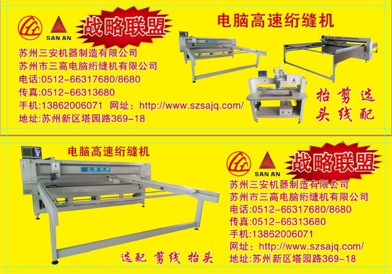 HFJ-D型电脑绗缝机的外形及规格。是制作各种床被、垫罩的缝制设备,缝制效率快、花样美观、图形精细。该产品总体布局合理,整体性好,并始终坚持吸收国内外先进技术与创新相结合的指导思想,以高起点、上档次、创国内先进水平为目标,精心设计,反复改进,目前已达到同类产品的领先水平。主轴伺服控制系统、X及Y向运动使用伺服控制系统,运行平稳、特低噪音、高精度复杂花形时可提高20%的效率。