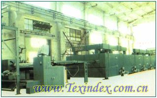 剖幅机车头进布---丁型储布机储布---绷架---上边浆---烘干---剖幅---扩幅---涂刷浆料---拉幅机车头进布---(垂直针铗运行)---压纹---冷却(三辊冷却)---收卷