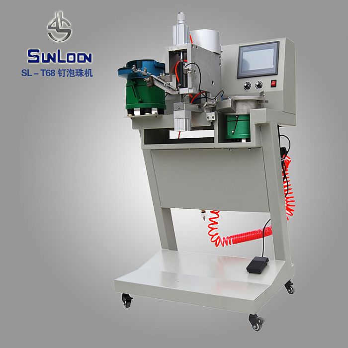 SL-T 68 高速钉泡珠机 技术参数 使用气压:220V 使用气压:0.4-0.8MPA 功 率:60W 工作效率:120-200粒次/min 可用模具:圆珠:4mm,5mm,6mm,8mm,10mm,12mm 机身尺寸:680X540X1100mm 机 重:80kg 产品说明 ●选用高速气缸冲压将四爪钉与珠子、饰钉铆钉合固 定于皮料、革料、布料、丝质料等服装及手袋、鞋皮 革之上。 ●采用红外线图案定位钉合,精准无误。 ●配备转流式珠料桶,双震动盘输送四爪钉及各种形 态的珠饰物。使钉及珠饰品在高速震动下顺畅完成钉 珠铆合。大大提高了生产速度。 ●配备可使用4mm,5mm,6mm,8mm,10mm,12 mm 圆珠子规格模具,方便随意更换。 ●三合一高速泡珠机是专为鞋面装饰、服装类、布类 花边、手袋、拼图、皮带、发饰、帽等流行服装饰样 式而研发设计的高速气动钉珠设备。 ●提高生产效率,节约成本,代替了传统手工艺钉珠 的效率及手工艺钉珠慢,更解决了服装订珠后易断线 掉珠的次质量问题。解决了生产中使用大量人为物力 交货迟的难题。保证了产品的质量以及交货速度。 ●配备有可调式非圆形饰物规格输送桥,适合钉塔尖 珠、圆桶珠、方形珠等的饰物输送钉合,速度更快, 效率更高。 ●设备选用高速滑块气缸铆合,使设备在每分钟达到 120-200粒次的铆合,比传统手动钉珠快8-10倍。