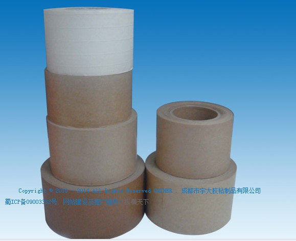 成都市宇大胶粘制品厂产品以“宇大”牌高级双面胶粘带,高级美纹胶粘带及牛皮纸胶带为主,此外还生产BOPP封箱胶带,牛皮胶带,EV泡棉胶带等胶粘制品.13348945888牛皮纸胶带是以牛皮纸为基材,在其一侧涂上胶水,使其形成具有粘性较强的胶带。自粘性牛皮纸胶带是以淋膜牛皮纸为基材,涂以丙烯酸胶或天然橡胶胶水制成,具有防水、粘性强、抗拉强度高、保持力好、不翘边、耐候性能稳定。湿水牛皮纸胶带以牛皮纸为基材,以变性淀粉为粘合剂制造而成。须湿水后方可产生粘性,其具有可在牛皮纸上书写之特点。适用于出口纸箱封口或遮盖纸箱字迹。