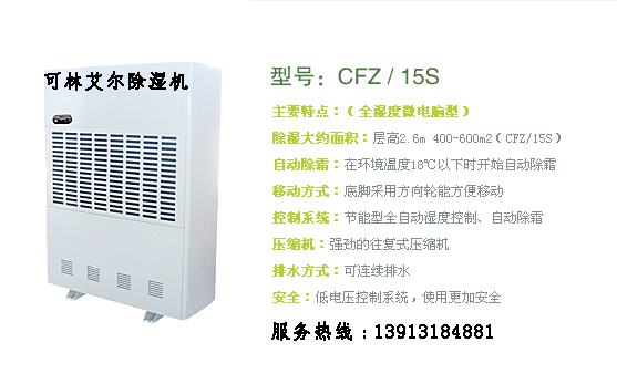 大空间需要除湿怎么办?用可林艾尔大风量除湿机,一键按住,轻松由你! 可林艾尔工业除湿机,除湿设备,仓库抽湿器,大功率除湿机CFZ-20S技术参数 除 湿 量: 480升/天 适 用 范 围: 550~700平方米/层高2.6米 电 源: 380V~50HZ 最大输入电流: 25.0A 额定输入功率: 10.0KW 除 霜 方 式: 自动 循 环 风 量: 5600立方米/小时 排 水 方 式: 水管 使用环境温度: 5-38℃ 压 缩 器保护: 三分钟延时 体 积: 450×1240×1750mm 净 重: 300kg 除湿量是在标准环境条件下测定的,如上CFZ-20S除湿量标 480 升 / 天,就是指在 30 ℃/ RH80% 的环境下 24 小时测定的出水容积。 可林艾尔工业除湿机,除湿设备技术说明: 1.控 制 方 式:全湿度显示,微电脑自动控制除湿,自动化霜. 2.压 缩 器:日本大金涡旋式压缩器 3.压 缩 器:三分钟延时保护. 4.排 水 方 式:水管连续排水 5.湿度传感 器:采用日本神荣湿度探头 6.移 动 方 式:地脚采用万向轮,移动方便 可林艾尔除湿器原理: cleanair除湿器产品属冷冻式除湿器,整器由压缩器、热交换器、风扇、盛水器、器壳及控制器组成,工作原理是:由风扇将潮湿空气抽入器内,经过制冷系统(压缩器,蒸发器,冷凝器)相互作用下凝结成霜,系统自动升温化霜成水, 产生出干燥空气排出, 如此循环使室内湿度降低,潮湿空间逐步达到干爽的效果 可林艾尔工业除湿机,除湿设备已广泛用于资料室、图书馆、电脑房、精密仪器室、医院及贵重物品仓库,化纤、制药、军工、玻璃、食品、电子、冶金、印刷、仓库、地下室、档案室、电力、电信、卷烟、医药、印刷、茶叶、纺织等对湿度有要求的场所。
