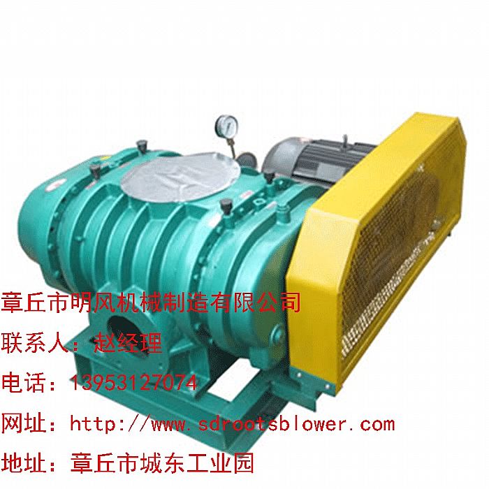 具有口碑的MFSR罗茨风机商_章丘明风罗茨鼓风机厂罗茨风机主要用途: 一、水处理鼓风曝气 二、医院的污水搅拌曝气 三、印刷行业的真空送纸 四、生活污水、工业废水的搅拌曝气 五、塑焊、吹风的气源 六、燃烧器的喷雾、玻璃工业 七、水产养殖 八、需要气源的其他设备.回转式风机具有噪音低的优点,尤其适合医院,小区等地的污水处理.罗茨风机安全操作规程步骤:1、在罗茨风机运转前检查配管联结部位是否坚固完好。2、在罗茨风机运转前确认阀门全部开启,以防止压力瞬间上升过高。3、在风机运转前确认接线情况、电源电压。4、在风机运转前用手转动风机的皮带轮,确认内部是否有杂物。若掉进了 杂物,则转动不灵活,且异常的声音产生。这时,必须拆卸配管,检查并清扫其内部。5、以点动运转确认回转方向,以皮带罩上箭头方向为准。6、在风机停机一小时后,拆下齿轮罩下面水平方向油堵,检查油位是否接近油堵螺纹下缘。油量过多时产生漏油、油温上升等现象。油量过少时产生齿轮干摩擦、风机发热、噪音上声等现象。每三个月换油一次,若油脏了,则应提前换。7、轴承润滑脂累计运行150小时加一次(三个月内不足150小时也必须用黄油枪打入),加注时须保证黄油确实以加注进入。补充油脂完毕后运行15分钟,确认多余的油脂从风机端盖的放油槽中流出。停机后擦掉多余的油脂。8、确认运转状态时的排气压力、电机电流值在铭牌规定值以下。9、风量过多时,要设置风量调节管路(旁路)或者用降低转速的方法来调整。不要用排气侧阀门来调整风量,因关闭排气侧阀门压力就会上升,设备有可能损坏。10、 皮带的松紧度必须合适,若皮带过紧,会使皮带发热而损坏,皮带过松也会使皮带过早损坏。11、 压力表开关除检查压力外,应处于关闭状态。