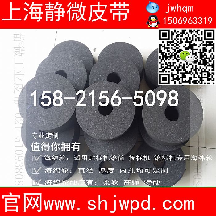 上海海绵轮生产厂家 海绵轮批发价格 海绵轮供应商 静微供 上海静微工业皮带是专业生产PVC,PU,PE,NBR等材质输送带和传动带,特别是海绵轮,外圆和内孔进口刀模一体冲压无接口,高弹海绵表面光滑,抗撕裂,黑色,海绵轮外圆直径和内孔厚度,现成海绵轮可当天发货,其它规格可定制。在质量和产量在国内已遥遥领先上。 海绵压轮主要用在包装行业贴标机;单面贴标机海绵轮;双面贴标机海绵轮;圆瓶贴标机;扁瓶贴标机海绵轮;全自动贴标机;不干胶贴标机海绵轮;半自动贴标机;输送线;锥形贴标机;非标的贴标机;非标自动化设备,全自动贴标机 单面圆瓶贴标机海绵轮,不干胶贴标机海绵轮,圆瓶贴标机 海绵压轮对于标签贴标机的功能不亚于胶滚筒,一张标签贴得是否整齐平整,是否可以连续不断地作业化生产,海绵轮起 了不可估量的作用,对于贴标机海绵轮来说,关键在于所选用的海绵必须具有高抗 撕、高耐磨、高弹性回复的“三高”特征,多年来静微公司一直与国内多个贴标机生产基地保持密切的合作! 静微公司专业生产贴标机海绵轮,输送带、传动带等系列皮带,以及代理原装进口输送带,传动带。我们非常熟悉什么样的贴标机设备配什么样规格海绵轮和蓝布海绵皮带,任何尺寸都可以加工。
